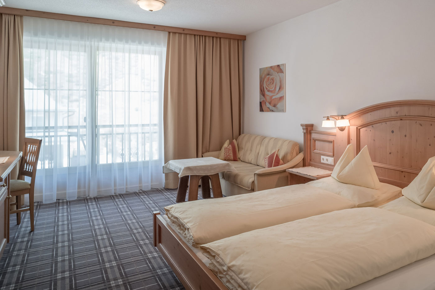 Das größte unserer Zimmer ist 36 m² alpine Gemütlichkeit. Die Sitzecke ist Treffpunkt zum Bergpläne schmieden und Ort der Entspannung nach der Gipfeltour. Der Naturholzboden holt den Wald direkt in Ihr Zimmer im Ötztal, während der Balkon zur Westseite mit seinem Ausblick inspiriert. Ideal für Paare, kleine Familien oder Freunde, die viel Raum schätzen.