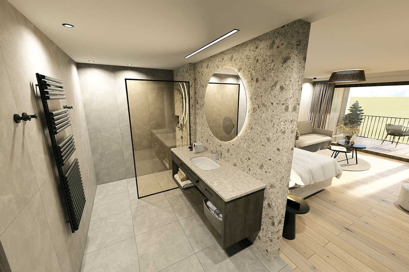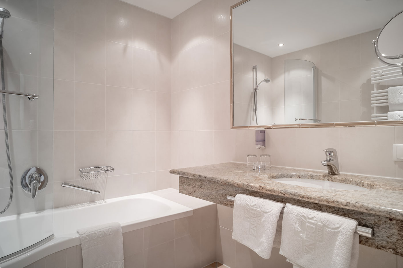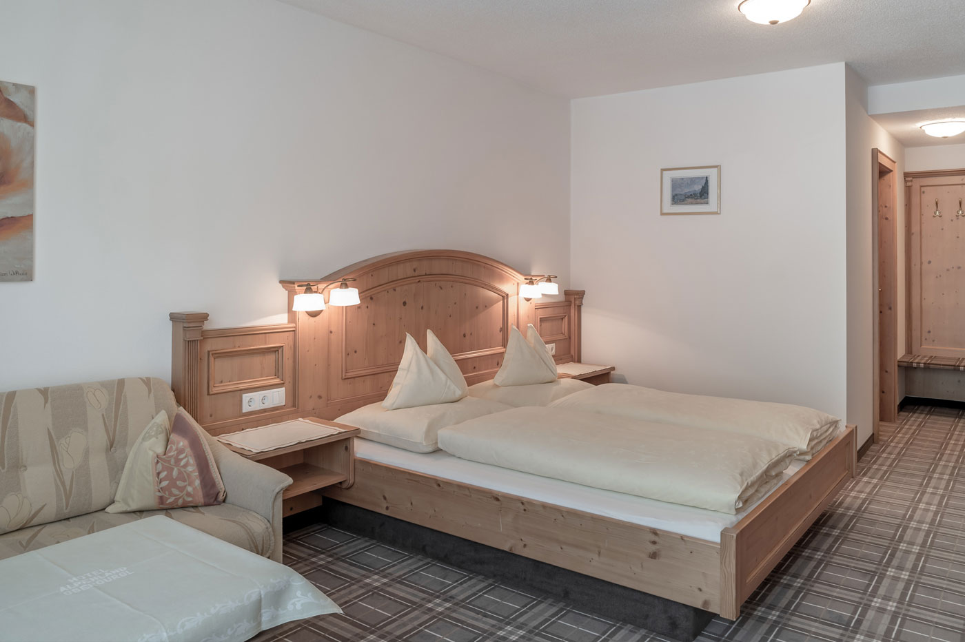 Elegantes Doppelzimmer mit französischem Balkon, der den Raum mit natürlichem Licht füllt und mit herrlichem Blick auf die Süd- oder Westseite begeistert. Das stilvolle Badezimmer ist mit einer Badewanne ausgestattet. Für ganz private Wellnessmomente. Eine teilweise integrierte Couchecke lässt sich bei Bedarf in ein zusätzliches Bett umwandeln. Ideal für Paare und kleine Familien.