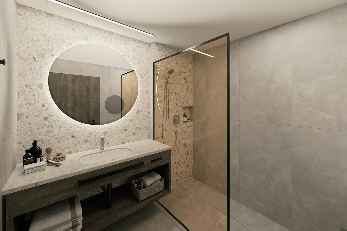 - Moderne Dusche, WC, Föhn, Kosmetikspiegel