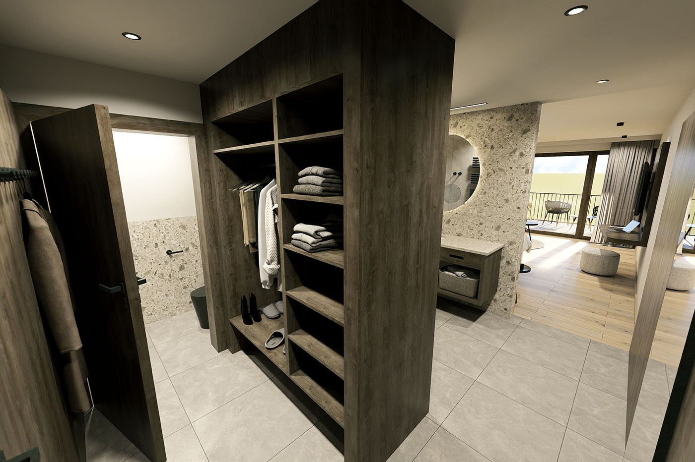 Der Balkon zur Westseite lädt ein zum Bergluftatmen und ist mit seinem schönen Ausblick wie geschaffen, um den Tag panoramaverwöhnt ausklingen zu lassen. Die naturbelassenen Holzmöbel schaffen Wohlfühlcharakter, während das stilvolle Ambiente eine einladende Atmosphäre kreiert. Der warme Holzboden lädt zum Barfußlaufen ein. Die Sitzecke ist viel zu gemütlich, um sie nur zum Kleiderablegen zu nutzen.