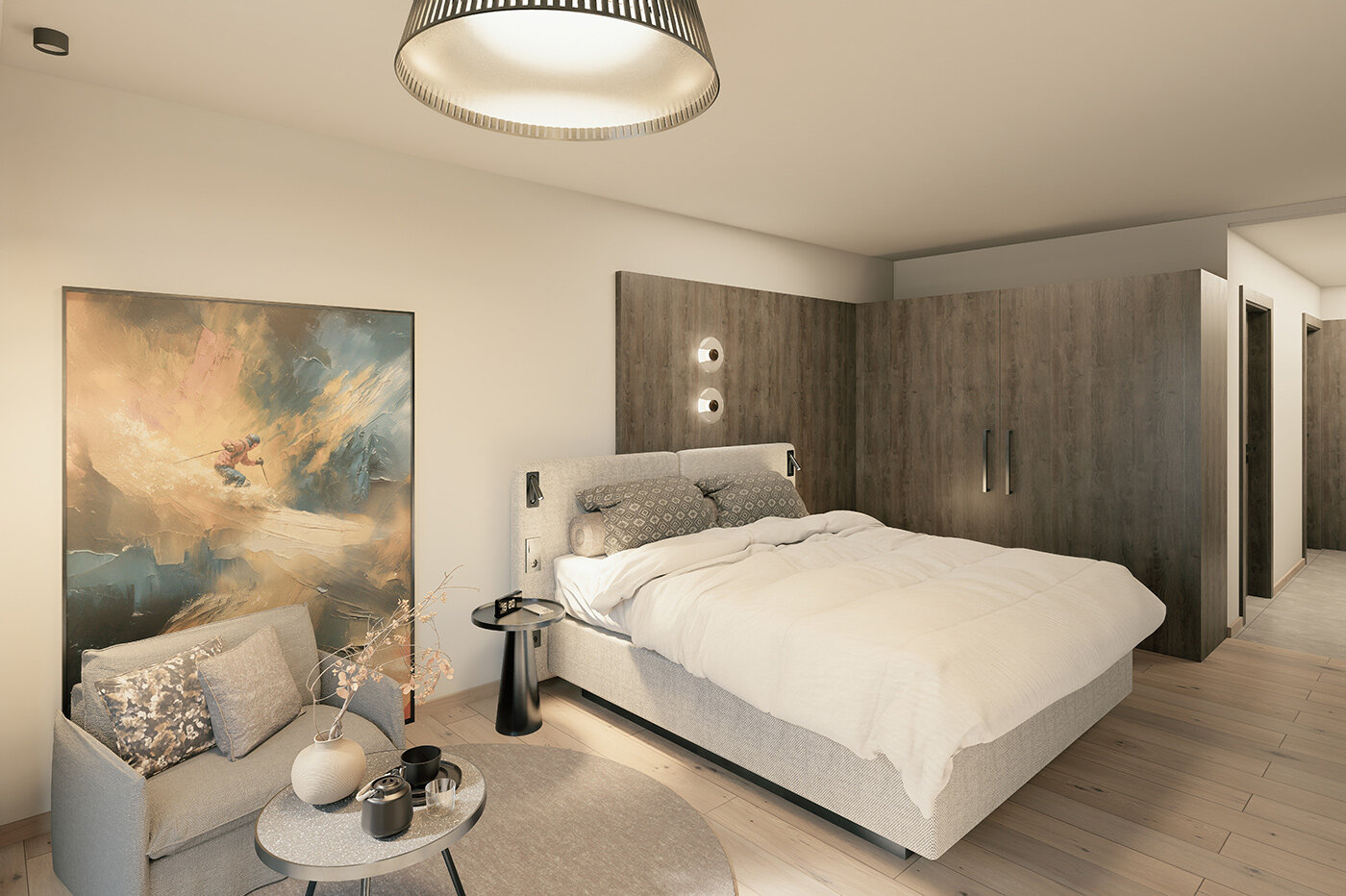 Elegantes Doppelzimmer mit französischem Balkon, der den Raum mit natürlichem Licht füllt und mit herrlichem Blick auf die Süd- oder Westseite begeistert. Das stilvolle Badezimmer ist mit einer Badewanne ausgestattet. Für ganz private Wellnessmomente. Eine teilweise integrierte Couchecke lässt sich bei Bedarf in ein zusätzliches Bett umwandeln. Ideal für Paare und kleine Familien.